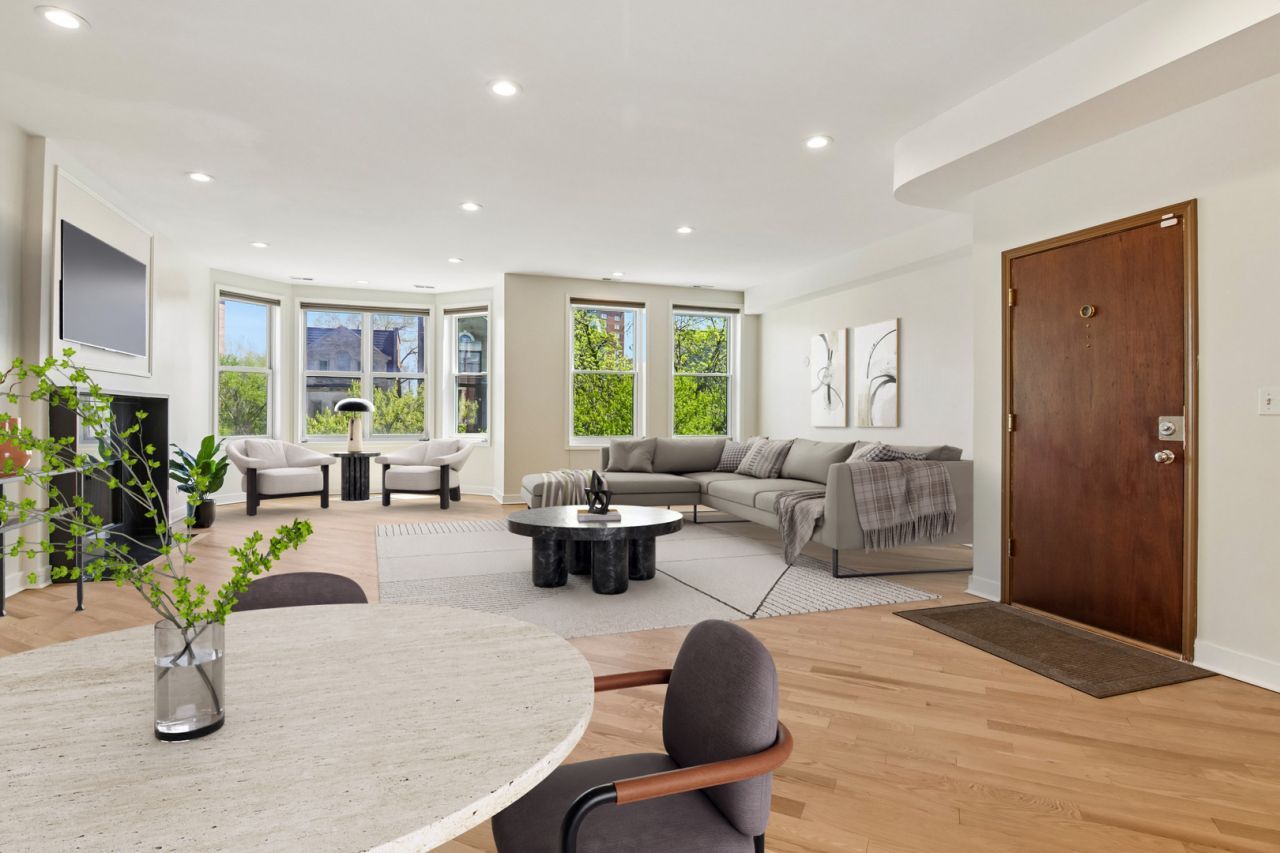 Spacious and thoughtfully updated 3-bedroom, 2-bath residence offering approximately 2,200 sq ft of modern living in the heart of Bronzeville! This stunning home features a massive open-concept floor plan flooded with abundant natural sunlight pouring in from the bay windows; perfect for both everyday living and entertaining. The new kitchen boasts sleek quartz countertops, contemporary finishes, and ample cabinetry. Enjoy the convenience of in-unit laundry with full-sized side-by-side machines. Stylish upgrades continue throughout with a beautifully renovated bathroom, updated lighting fixtures, and a striking fireplace with a modern accent wall. Step outside to relax or entertain on your rear deck. Additional highlights include a 1 garage spot, 1 gated exterior spot, and 1 private storage room.